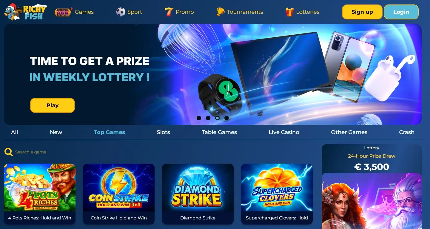 The platform operates under a Curacao licence and claims to adhere to responsible gaming principles. Its strength lies in its extensive range of entertainment options, which includes online slots not on Gamstop, sports betting, live casino, tournaments, and lotteries. The catalogue includes popular games such as Razor Shark, Rise of Olympus, Arabic Roulette, and Blackjack Live. Our expert review highlights that the operator only works with trusted developers, including Microgaming, Evolution Gaming, Wazdan, and Habanero. The convenient menu and logical categorisation allow you to quickly find the titles you want.